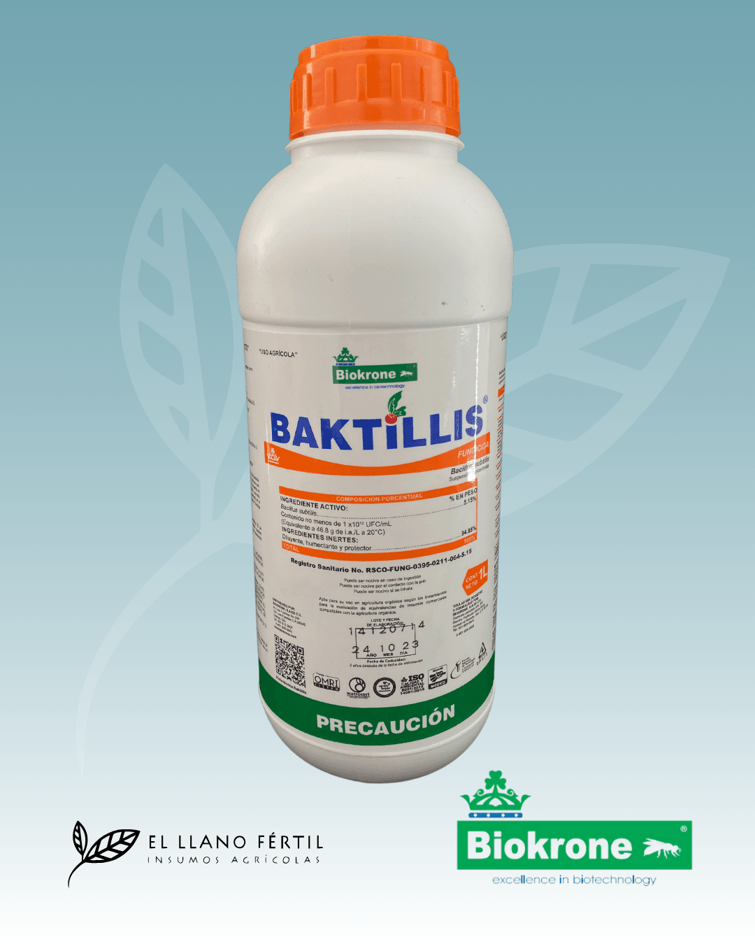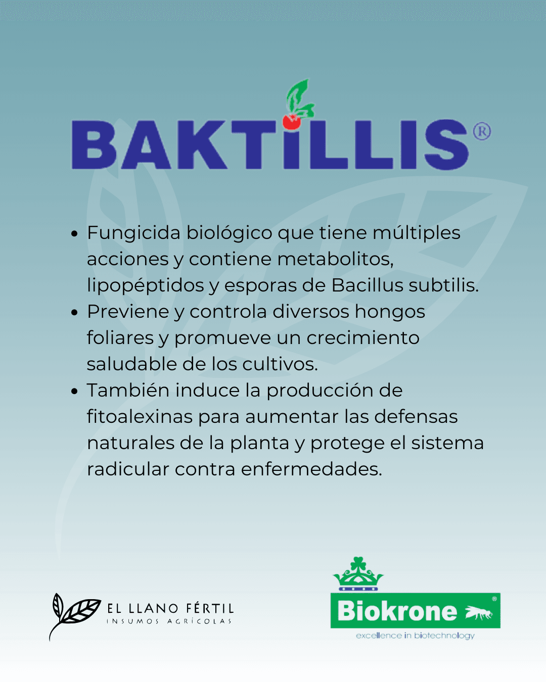 BAKTILLIS es un fungicida biológico formulado con esporas de Bacillus subtilis y metabolitos. Su acción de debe a los metabolitos tales como subtilina, bacitracina y toximicina y enzimas que activan los mecanismos de defensa de las plantas.